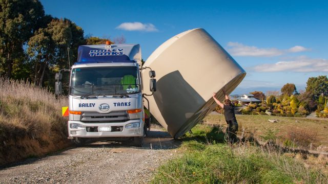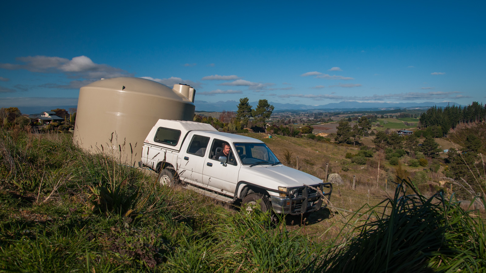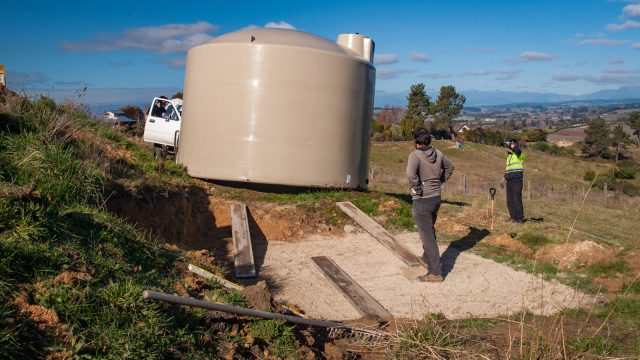 “Are we really going to just push that tank off the truck? Don’t they deliver with a crane?”“You guys hold it so it can’t roll down the hill!”“YOU HOLD IT!!” (tank spinning around)“Phew! That was close!”“How are we going to get it from here to there?”“Get some straps and pull it with the truck!”“Then give it a little push, up the last bit”“We’re almost there!”There it is! 30,000l extra water storage for the next summer.