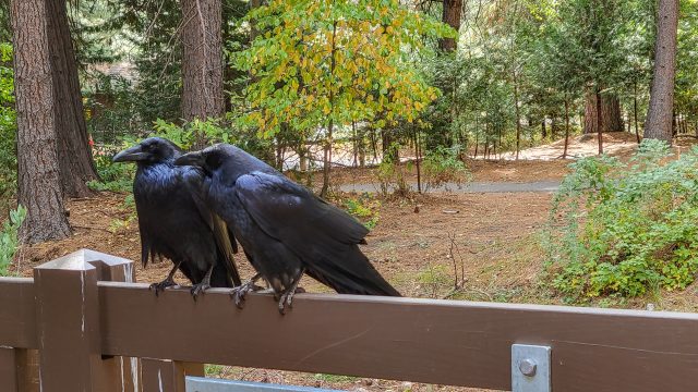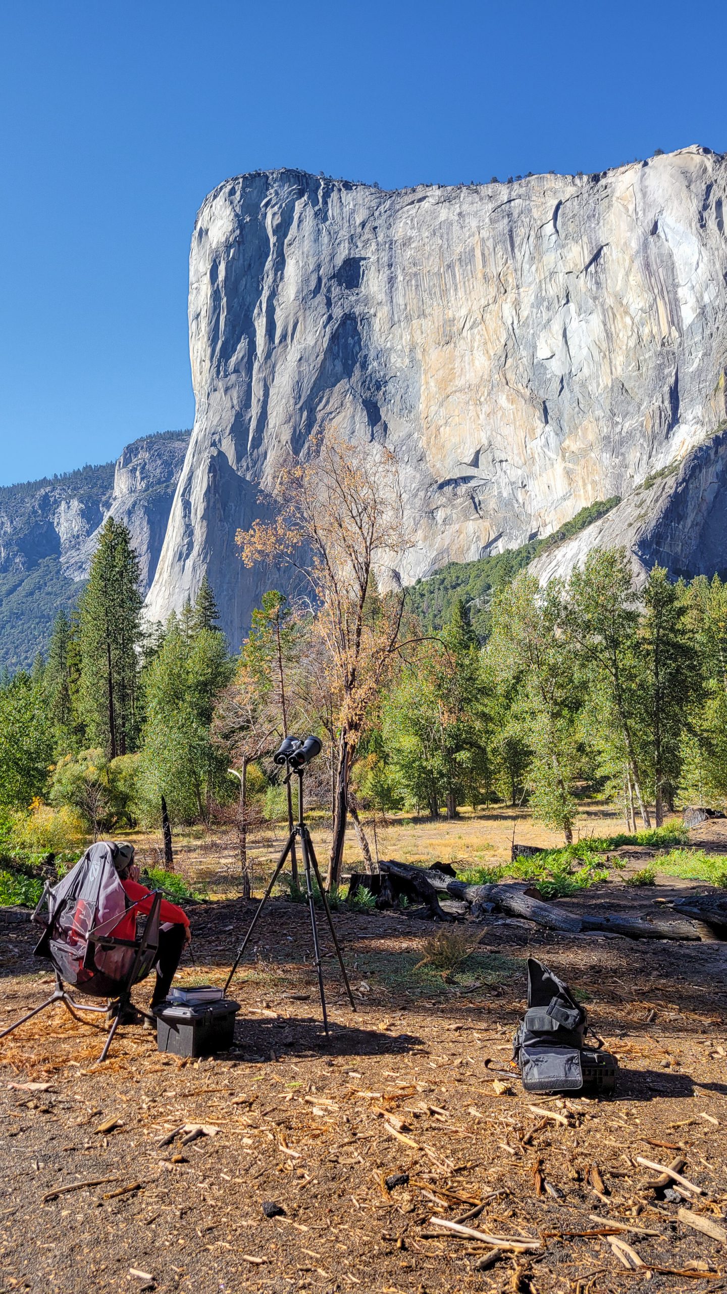 A sign often seen in the park, but even though bears are an uncommon sight nowadays, if you encounter one, it’s probably a sudden appearance in front of your car.Resting area on our daily walk.Two very unfazed ravens eyeing our lunch.El Capitan. Just off the road, this guy is pondering over his shot.While this one needs a break from sightseeing.Could stay here for a while.The valley vanishes behind the hills, with Half Dome still visible.The Three Brothers, with the left one being Eagle Peak.El Capitan over the Merced River floor.