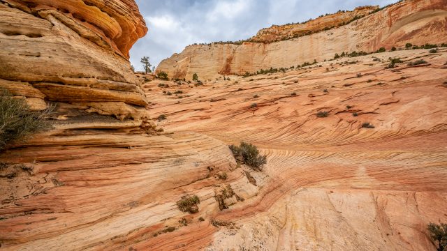 Zion was a relatively flat basin near sea level 240 million years ago. As sands, gravels, and muds eroded from surrounding mountains, streams carried these materials into the basin and deposited them in layers. The sheer weight of these accumulated layers caused the basin to sink, so that the top surface always remained near sea level.As the land rose and fell and as the climate changed, the depositional environment fluctuated from shallow seas to coastal plains to a desert of massive windblown sand. This process of sedimentation continued until over 3.000 m of material accumulated.Mineral-laden waters slowly filtered through the compacted sediments. Iron oxide, calcium carbonate, and silica acted as cementing agents, and with pressure from overlying layers over long periods of time, transformed the deposits into stone.Ancient seabeds became limestone; mud and clay became mudstones and shale; and desert sand became sandstone. Each layer originated from a distinct source and so differs in thickness, mineral content, color, and eroded appearance.Tunnels make travels from Zion to Bryce Canyon possible.In an area from Zion to the Rocky Mountains, forces deep within the earth started to push the surface up. This was not chaotic uplift, but very slow vertical hoisting of huge blocks of the crust. Zion’s elevation rose from near sea level to as high as 10,000 feet above sea level.This uplift gave the streams greater cutting force in their descent to the sea. Zion’s location on the western edge of this uplift caused the streams to tumble off the plateau, flowing rapidly down a steep gradient.A fast-moving stream carries more sediment and larger boulders than a slow-moving river. These streams began eroding and cutting into the rock layers, forming deep and narrow canyons. Since the uplift began, the North Fork of the Virgin River has carried away several thousand feet of rock that once lay above the highest layers visible today.With all this information from the geology boards we need a little lunch break.The Virgin River is still excavating. Upstream from the Temple of Sinawava the river cuts through Navajo Sandstone, creating a slot canyon.At the Temple, the river has reached the softer Kayenta Formation below. Water erodes the shale, undermining the overlaying sandstone and causing it to collapse, widening the canyon.But today, we’re still in the area behind Mt Carmel tunnel and stop at every single turnout to be awed by the work of iron oxide.Also the photogenic placed rocks and windswept grooves in otherwise flat hill sides are interesting features to look at.Basically every stone a picture.Some could be giant prints for the pantry.And a small one for the office desk.A thumbnail for the wallet.