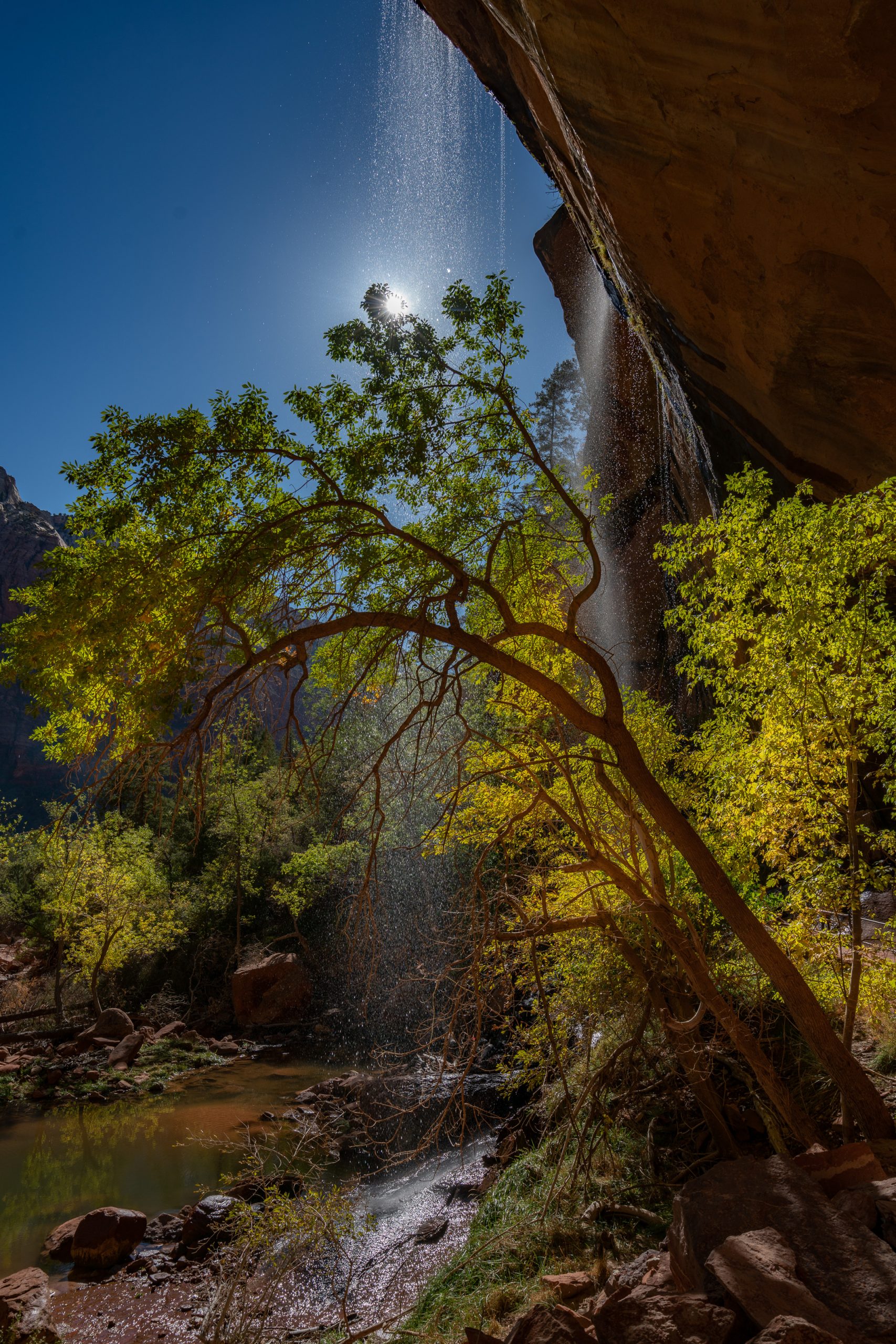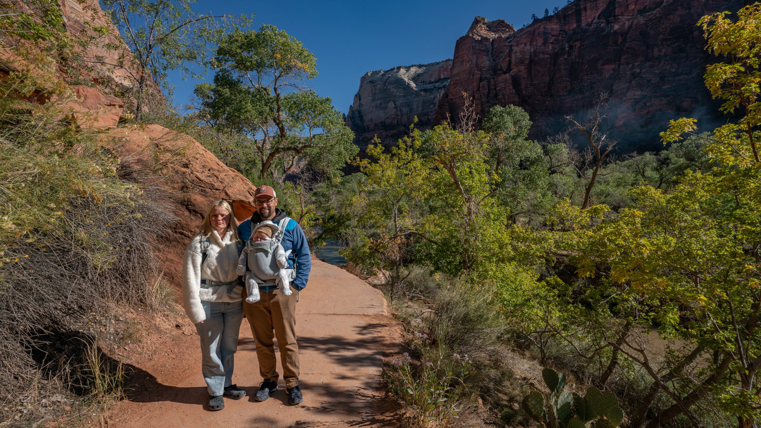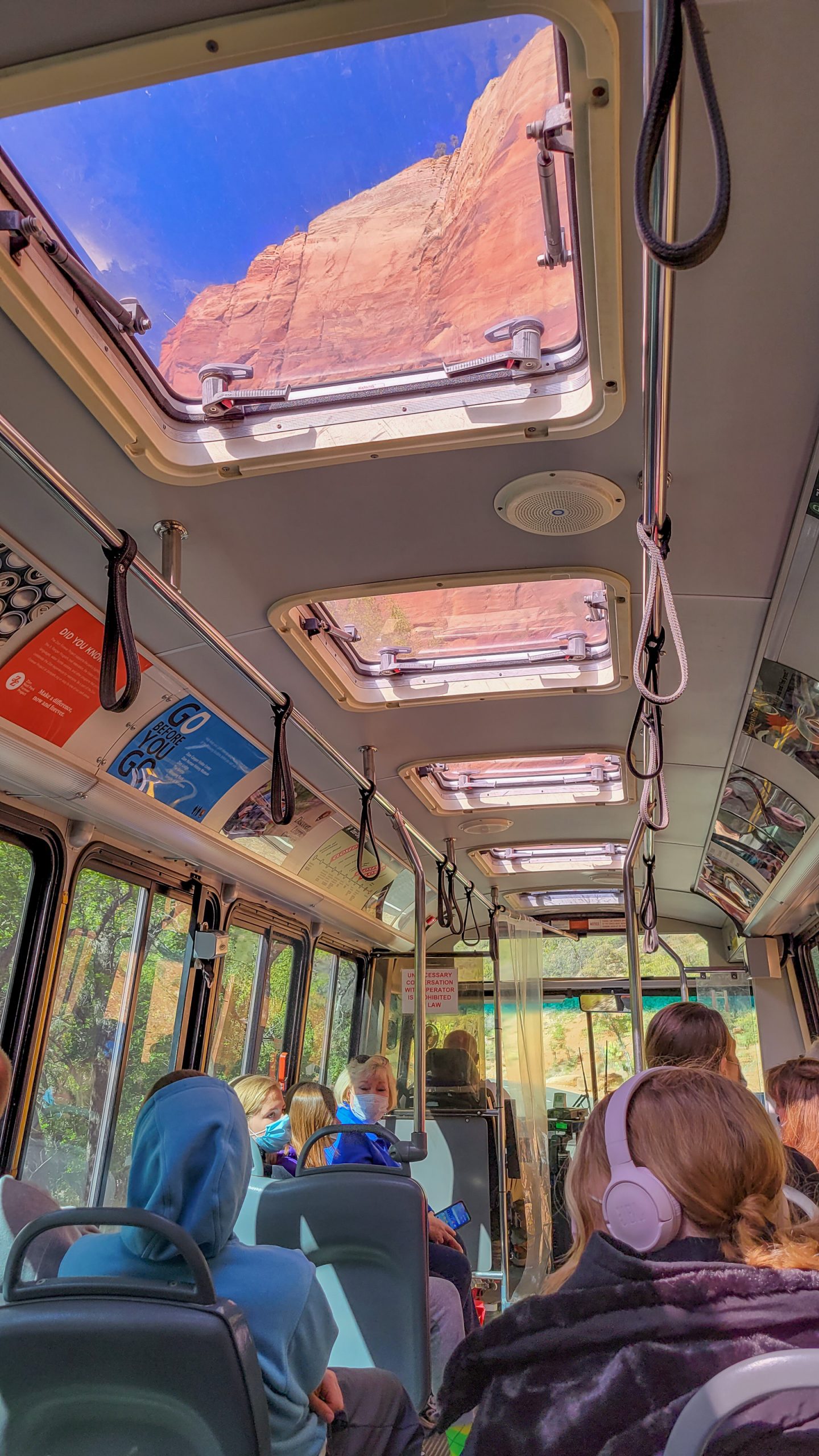 The day starts with the search for a parking space. The huge parking around the visitor center is insanely full already when we turn up so we park outside the park and walk in.The bus fills quickly, everybody stares through the skylights.Our boy is easily rocked to sleep just by walking steadily. We leave the shuttle at the Zion Lodge.Up we go, following the highway to the Emerald Pools.The higher we come, the more peaks peek through the trees.The first pool is filled by a stream that falls over a wall overhang, the path goes behind.Must be stunning in spring with all the melting snow.The trail is tucked safely in the sandy ledge at the back of the wall.Views!Further up we go!This walk has everyting, from canyons, caves/caverns to waterfalls and pools, very worthwhile.Water, even though Yosemite was completely dry, here it drizzels.The second pool that feeds the cascade.Back at the shuttle we take it to the Temple of Sinawava. Just a curious 30 min walk along the Virgin river, then we turn around, the day is advanced and we have booked an airbnb near Bryce Canyon.Eyes up and out we shuttle.Following the Mount Carmel Hwy along Pine Creek.East Temple.Thank you Zion, for all the orange glow, learned a lot about the staircase today.Saying good bye to the red glow, the red mountains, the red streets.