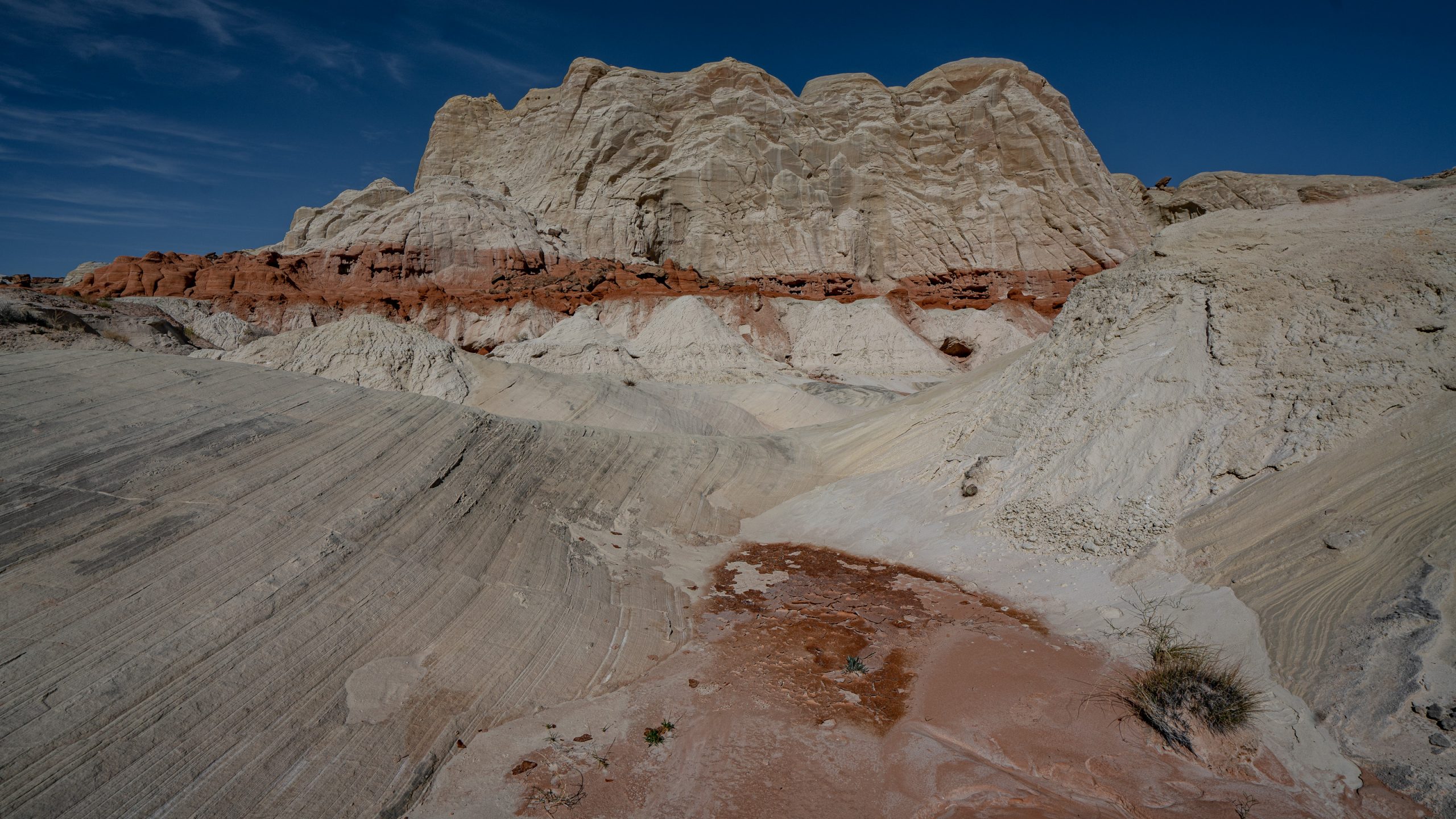 Stopping just because we needed a break, and also the hills around here look great.The geological area between Paria and Wahweap Rivers seems to be prone to forming hoodoos, we learn.So we go looking for the promised toadstools. It’s an easy 1 hour walk (or more if you decide to investigate further, there’s a lot to see)The path through the rimrocks is narrow and we’re lucky the river is dry at the moment, so we use both, main road and river bed to get forward.Not long after we’re greeted be the most impressive of them all, just standing there with its companion rocks, with hat and all.A toadstool family!The Toadstools were created when boulders rolled off the adjoining cliffs, they form when a softer rock erodes away, leaving a column sheltered from the elements.Time to turn around!A hiker left this footprint in the mud and conservated (maybe forever)After the mud flows, the ground dries out completely, leaving only broken crusts.We descent back into the valley where the parking lot is.One last look back.