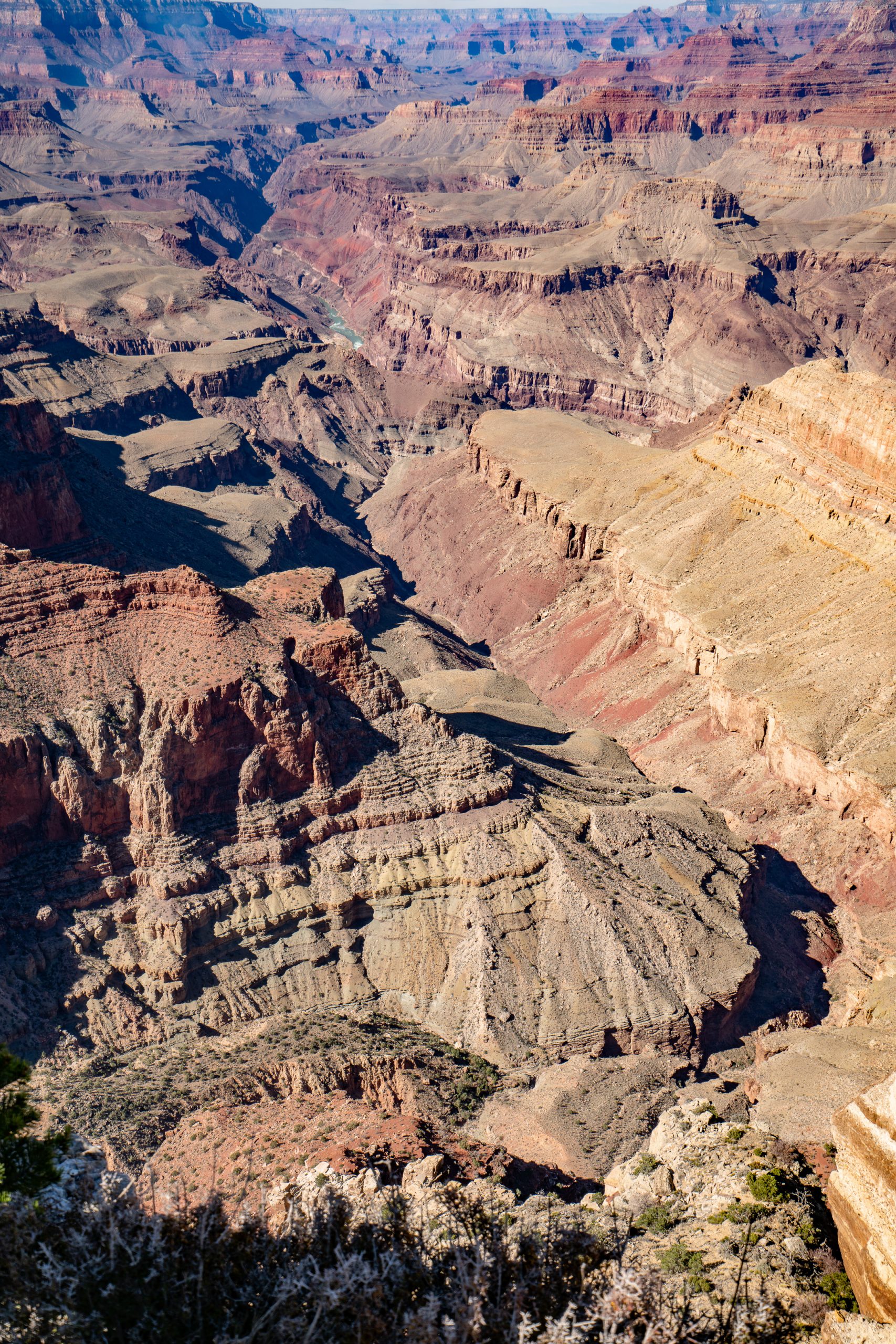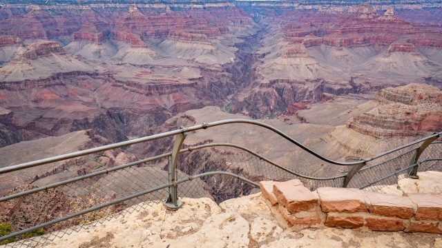 After an exhausting drive we can’t just check in the lodge before checking out the views ;)And it’s so much bigger than we remember it! Signs say it is 446 km long, up to 29 km wide and attains a depth of over 1.857 meters.All these rock layers have a huge part of all the information boards, but the main attraction here of course is the cut itself.After all the layers were deposited, tectonic uplift and then erosion followed, forming this masterpiece of touristic America.These pictures are taken from the South Rim, where the Visitor Center is, overlooking the higher North Rim.There even is a color palette color that is named “Canyon Red”. Now we know why.Holding on to the railing we stare across the wide open.