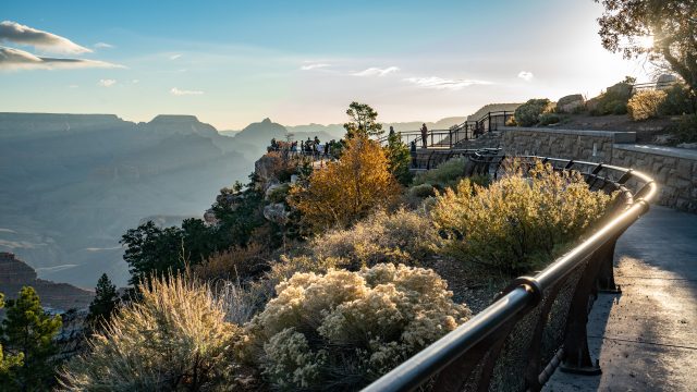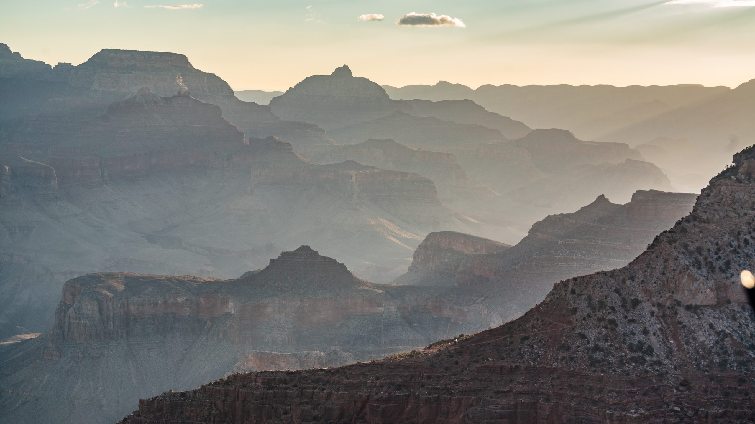 Just a few minutes before the expected sunrise I got woken up and quickly dragged to the car to see the first bright rays touch the rim.Having seen the big gap in different light situations already, I have to say this is my favorite.The hand rail is ready to be hung over!The golden glow hangs over the table tops.We’re not alone, even more people are swarming the lookouts than there were yesterday in the evening.The shadows will soon lift to reveal the valleys and gorges beyond.It will be a beautiful day :)Most of the vistas are on the main rim walk, which is just a few km around the visitor center.Helped selfies.Canyon Red in action,