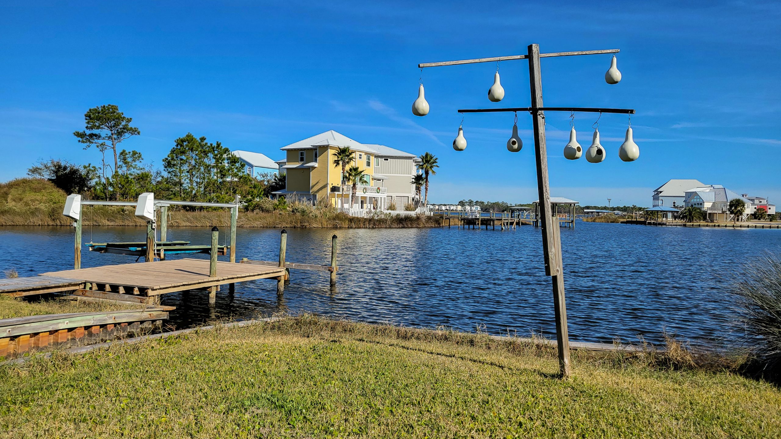 Is there snow in Alabama? Are our eyes once more tricked by gypsum, sand or some other weird phaenomenon?No! At a closer look it turns out to be cotton bloom, huge fields with puffy white cotton on already dry stalks. So lucky to see end of November still (In North Alabama the main flowering season is September, but the climate seems warmer down here at the gulf coast).Cotton Boll Cotton, perhaps more than anything else, was the driving economic force in the creation of Alabama. The search for land to grow cotton attracted the first settlers into the state’s river valleys. Cotton also created the two dominant labor systems, slavery in the Old South and sharecropping in the New South. Production per acre swelled in the 1880s, but began to drop due to a number of factors including soil erosion and productivity. English said steel and iron production in northern Alabama became more important to the state’s economy, and the demand for Southern cotton slowed as overseas sources drove the price down.We can imagine driving a spinning wheel with this or just growing a santa beard.Random picture at the side of a road: Every town, every so tiny seems to have a massive flag pole somewhere and we figured there must be tens (or hundreds) of thousands of these big-as-a-house super flags around. In Gastonia, North Carolina, which is a little more than 20 miles West of Charlotte, the town lays claim to having the largest flying American flag. Just outside the Crowder’s Mountains, the flag is 114 feet wide by 65 feet tall, totaling 7,410 square feet. Each stripe on the flag is five feet tall, For it to fly, it is attached to a pole that is over 225 feet tall and has a diameter of five feet. The pole itself weighs about 80,000 pounds, about the same as a fire truck. But on a good day, the flag can be spotted from over 30 miles away… Not this one though. Still big enough for us.Arriving at Gulf Shores. This is a small strip of condo towers and smaller dwellings along the beach and reminds us much of Honolulu (just without excess warmth, we gladly wear our hoodies).Over the street from our house we make contact with white sand. It takes us a few minutes to loose the awe and run a few meters on the beach.Small fenced paths lead over the dunes to the hotel blocks.Pear-shaped painted squash bird houses? Not sure! If you know more, please get back to us on social media so it can be labeled correctly ;)Walking the boards at Wade Ward Nature Park. Pristine swamp on the tourist mile, great to see alligators, they said.There even are safety notices (as if they would jump 4 meters in the air onto the board walk? Or would they???We tried hard, didn’t even spot one with the tele.The Sunliner Diner is the quintessential symbol of American culture, where family and friends can connect over hamburgers and cherry pie, listen to rock-n-roll and even take a spin down Beach Road in one of the classic Sunliner convertibles available to rent in front of the restaurant.Pier 33 Grocery Store. Established in 1978, Pier 33 is Gulf Shores oldest grocery store. They carry a full line of grocery items, gifts, souvenirs, and bait & tackle.The former flip flop deli shop, currently closed.Liquor store (even though spirit can be sold in supermarkets here, even with astonishing variety).Gulf Shores Public Beach in xmas mode.This angle is even more dramatic lolBack at the beach in time for the sun to set.Comfortable beach life.Even more so! Boards and chilly bin inclusive ;)Some parts of the beach haven’t recovered from hurricane Sally in 2020, some of the fences and even roofs are still in repair or just hang sideways a bit.Now all the people come out to play :D The instagram herd!Little C. telling Dad all about the new things he saw and learned today.A few nice sundown pics I’d like to share!Glowing waves.Glowing waves, must be mist.