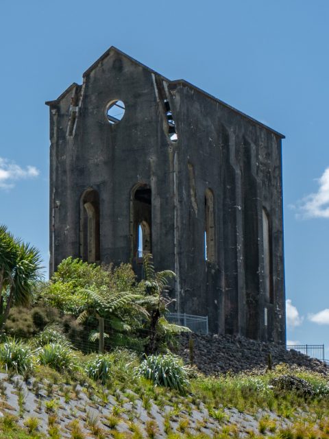 Pit Rim Walkway at the Waihi Martha Mine, currently owned and operated by the australian company OceanaGold. Open mining is a thing of the past, today there’s only one entrance left that leads to a net of underground tunnels. Part of the roads (on the left) is already collapsed.Must have been like building the pyramids, just inverse. We can but wonder how much gravel (and gold) has been extracted from this site to come this far.The old pumphouse.“Charging” walk through Waihi township.Memorial Hall.Murals: An advertising for Waihi Art School, how clever.For your bach at home!Decorative corner.Is the painting girl looking up to the horse or vice versa?It’s almost time for lunch *grumbling stomach agrees*Just a few more photos!Almost back at the charger.The Rob Roy.And us! Finally putting these saussages on a grill. Also available: Sourdough baguette, sauerkraut, leftover rice. All warm and greasy!Enjoy!Our lunch spot today. Mahlzeit!
