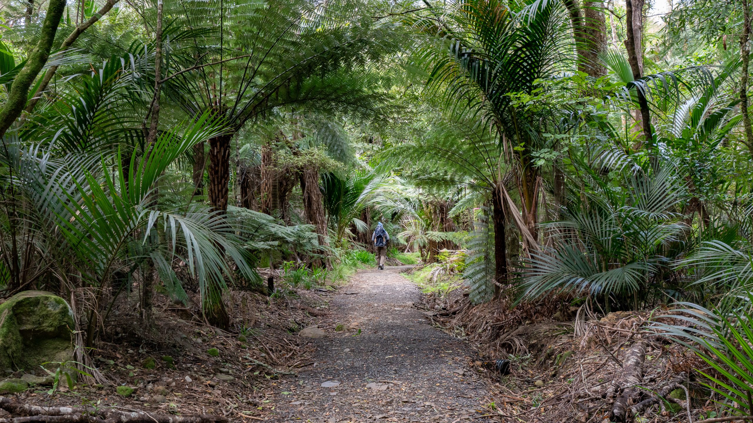 The disease is caused by a microscopic fungus-like organism, called Phytophthora agathidicida (PA). It lives in the soil and infects kauri roots, damaging the tissues that carry nutrients and water within the tree, effectively starving it to death. Only way to protect kauri is to enter walks with clean equipment, especially shoes (or clean them thoroughly at cleaning stations like this one above) – and stay away from kauri trees, give them some slack.From the start, the walk is defined by the NZ native bush plants, including fern trees, nikau, mahoe, kawakawa, rimu, kauri … and lots of smaller shrubs.Nikau palm trunks. Even though they prefer the subtropical climate, they also like shade, the less light they get, the bigger their leaves get.Punga shots. These are the new leaves of a tree fern, still rolled up in a shape that’s called koru – symbolizing growth, physically and spiritually.Old gold mine entry. After 5 meters a collapse stops any spirit of adventure though.A few hundred meters on this gold mine rests forgotten and will soon be gone.The Wentworth River.Another new punga leaf.Touch and feel opportunity for the little explorer.Reaching the bridges, the falls must be just around the corner…Together, these two falls are a drop of approx. 50 m.The upper fall from above.